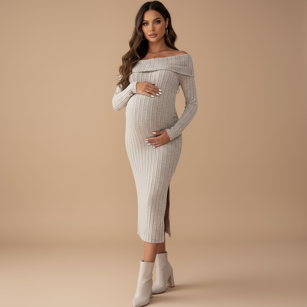 This one-shoulder maternity dress combines soft seasonal knitwear with a sleek, elegant silhouette. With its slimming fit, long sleeves and asymmetric neckline, it’s perfect for photoshoots, baby showers, special occasions, or any moment you want to feel confident and radiant.